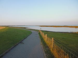 Fast genauso weit ist es vom Strandparkplatz in Westermarkelsdorf zum Fastensee. Auch hier kann man auf oder hinter dem Deich entlang wandern.