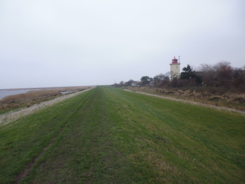 Am Ende der Asphaltstraße geht es dann wieder durch ein Tor auf den Deich. Recht sehen wir den Ort Westermarkelsdorf. Weiter voraus kommt dann alsbald der Leuchtturm (rechts) in Sicht. Links liegt nun der Salzensee.